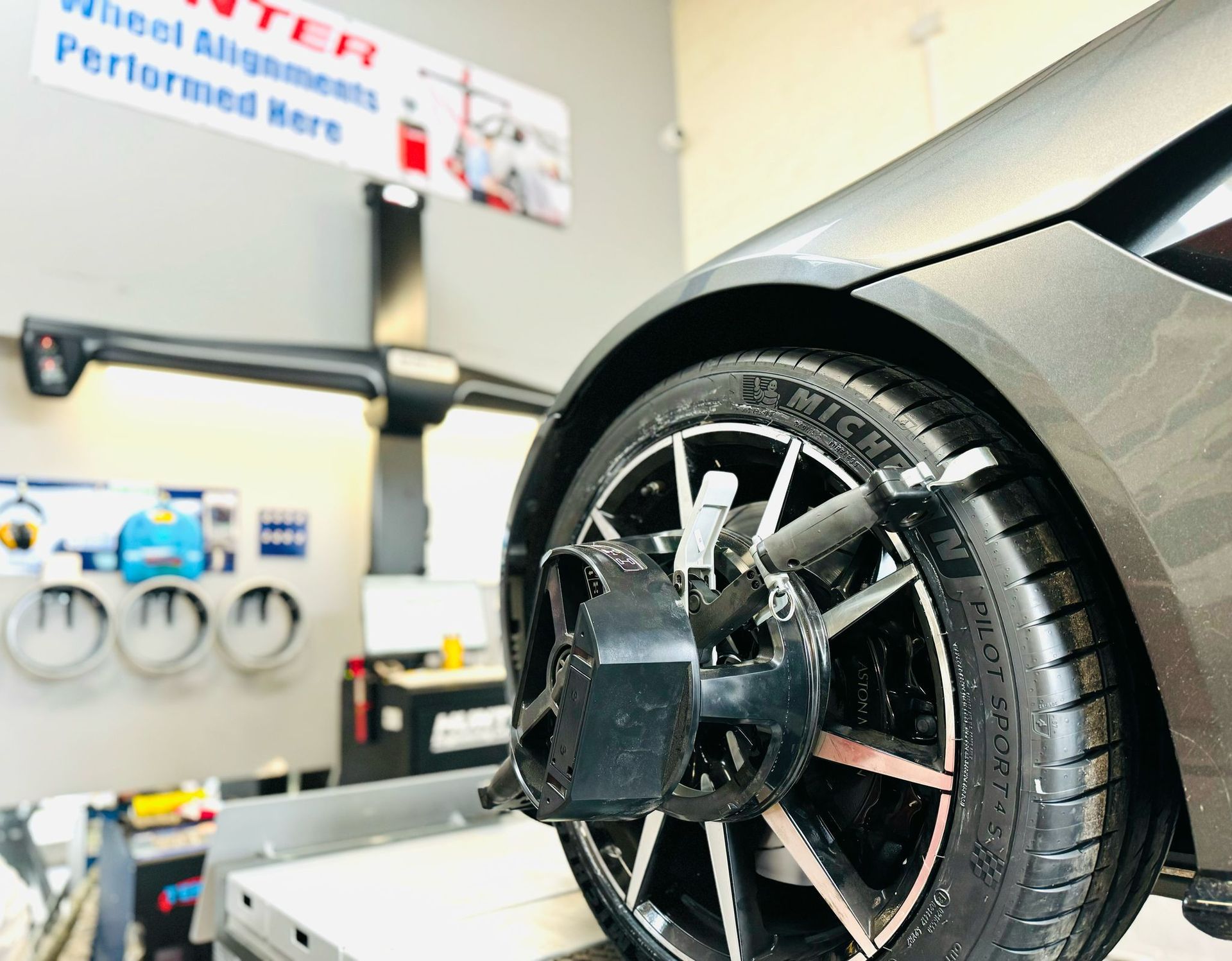 Here is a short video clip. Click the arrow symbol on the video clip to see how the wheels are set-up to measure the alignment of your wheels.